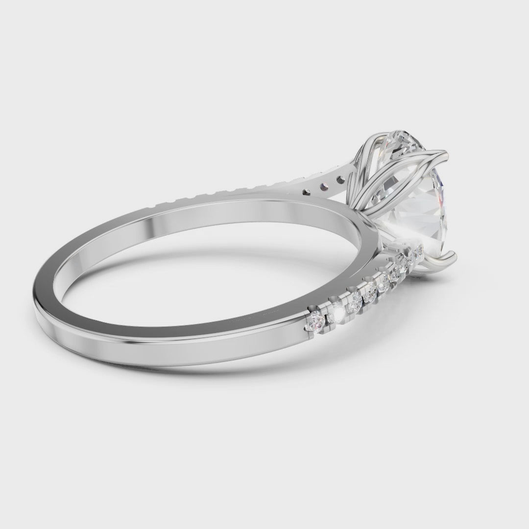 The main stone is beautifully complemented by a pavé setting on the band, where smaller, sparkling Moissanite accents line both sides of the shank. This dazzling detail adds extra brilliance and a delicate, luxurious look. The sleek, split-shank design gives the ring a modern flair while maintaining classic elegance.