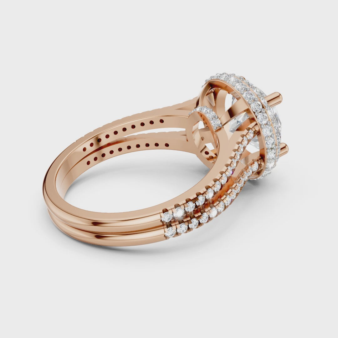 • Split Shank Pave Band: The bold split shank band is completely covered in delicate pave-set accent stones. This intricate design not only adds to the ring's overall sparkle but also provides a luxurious, comfortable fit.